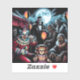 Halloween sticker. Spooky clown, vampire, zombies and haunted doll come to life under a full moon at the carnival holding black and orange balloons. Creepy ai art.