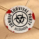 Vintage look round sticker for a zombie survival-themed party, with a weathered sign and blood stains.