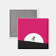 A magnet with a cool zombie dude. Pink and black bold vibrant colour scheme. A zombie silhouette with arms outstretched on the hunt for brains. A big white moon illuminates from behind.
