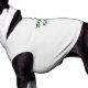 I was a bit leery about ordering this for our Bernese based on only "85 lbs plus" for the 3XL, but she needs sun protection until her fur grows back. When I opened the package I thought it looked really small but tried it anyway, and to my surprise it not only fit but fit well, with a bit of room to spare. The cut/pattern is good. The material is like a thin tee but that's all I wanted anyway. It arrived really quickly. The name is smaller than I thought but that may just be me misremembering. The printing doesn't really stand out on the grey shirt, but that's to be expected.