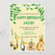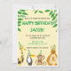 This is our special Zoo themed birthday party invitation, With green leaves and animals like Monkey, Kangaroo, Giraffe and a Parrot.